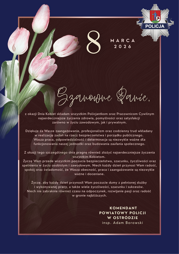 8 marca - Dzień Kobiet - Życzenia Komendanta Powiatowego Policji w Ostródzie Dodano: 08.03.2026