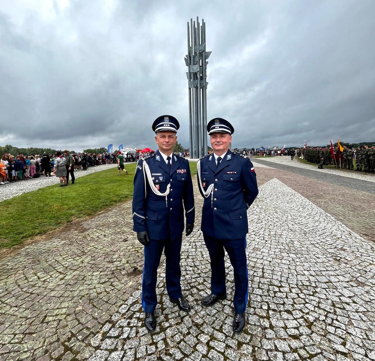 Policja, KPP Ostróda, Komendant Wojewódzki Policji w Olsztynie insp. Mirosław Elszkowski, Zastępca Komendanta Wojewódzkiego Policji w Olsztynie mł. insp. Mariusz Wiśniewski podczas uroczystego złożenia kwiatów pod Pomnikiem Bitwy pod Grunwaldem, XXVI inscenizacja największej średniowiecznej bitwy na Polach Grunwaldu -