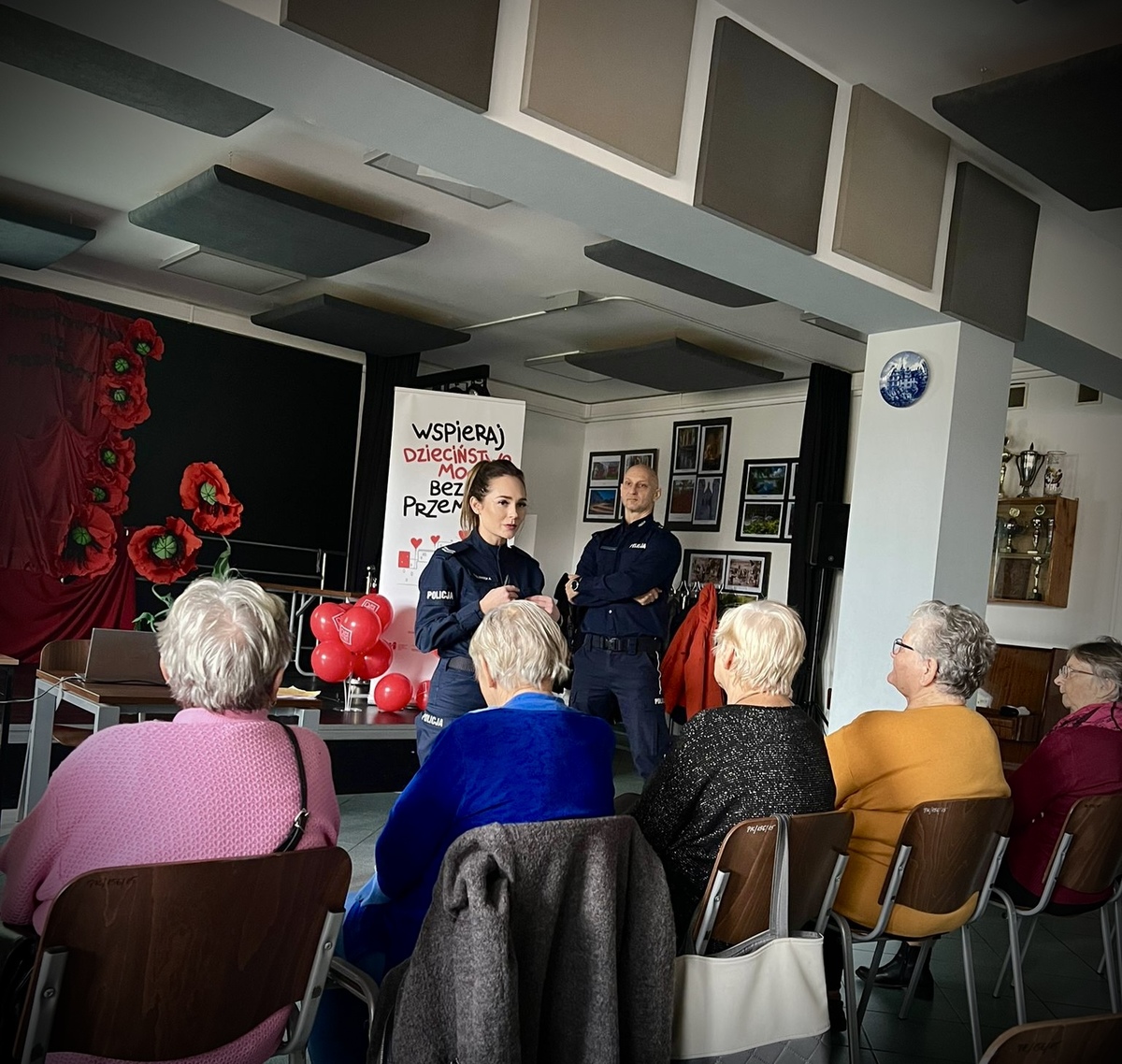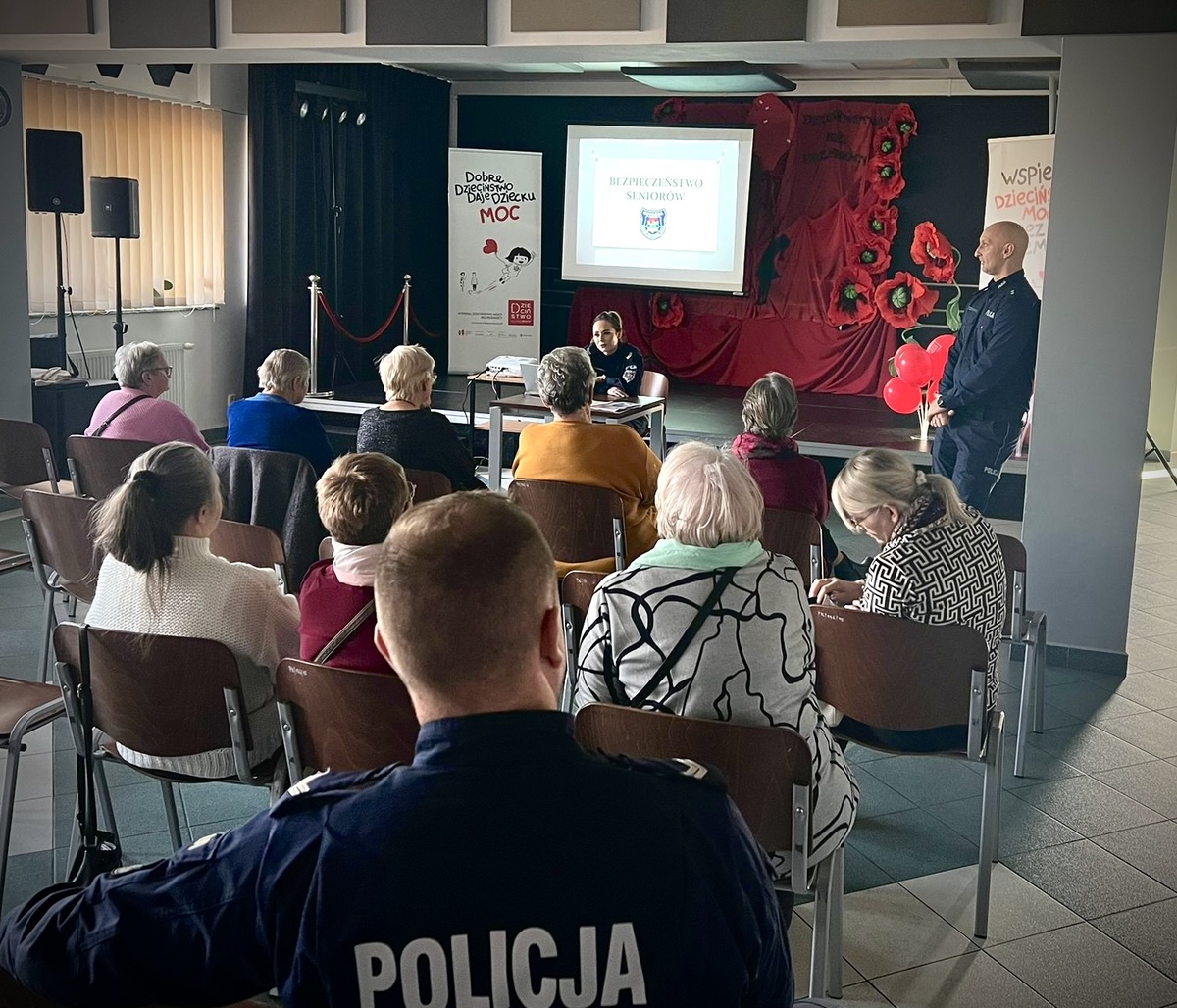 W poniedziałek (25.11.2024r.) policjanci z ostródzkiej komendy oraz policjantami z Posterunku Policji w Dąbrównie spotkali się z seniorami w Gminnym Centrum Kulturalno-Bibliotecznym w Dąbrównie.