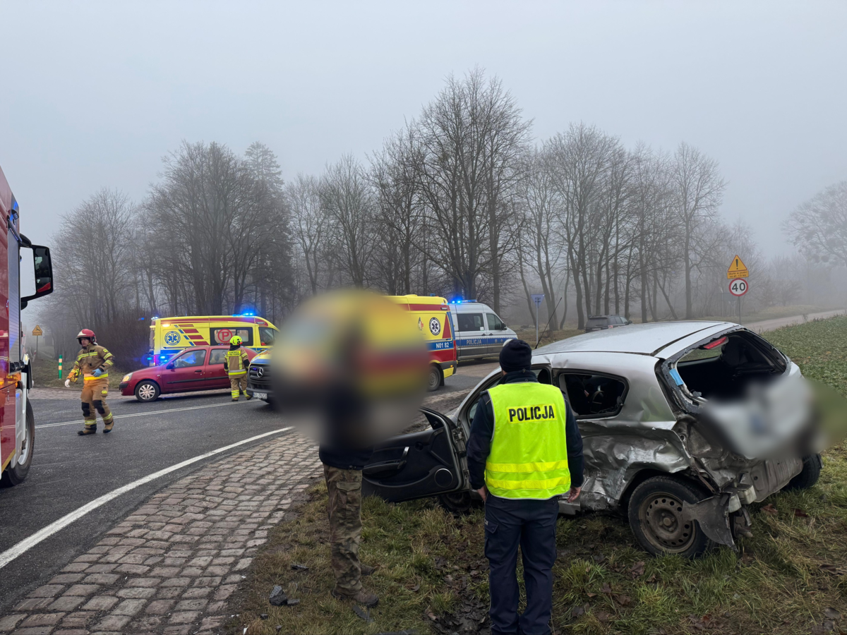 Również w niedzielę po godzinie 14:00 policjanci zostali zadysponowani do kolejnego zdarzenia drogowego do którego doszło na odcinku drogi Smykówko-Nastajki w rejonie skrzyżowania dróg. Jak ustalili policjanci będący na miejscu zdarzenia, 79-letnia kierująca samochodem marki Chevrolet jadąc drogą od miejscowości Nastajki, na skrzyżowaniu z drogą krajową nr 15, nie ustąpiła pierwszeństwa przejazdu 66-letniemu kierującemu samochodem marki Dacia, jadącemu od Ostródy w kierunku Iławy. Doszło do zderzenia się obu pojazdów. Zarówno kierująca chvroleta jak i kierujący dacii wymagali hospitalizacji. Przeprowadzone na miejscu zdarzenia badania stanu trzeźwości kierujących nie wykazały nieprawidłowości.