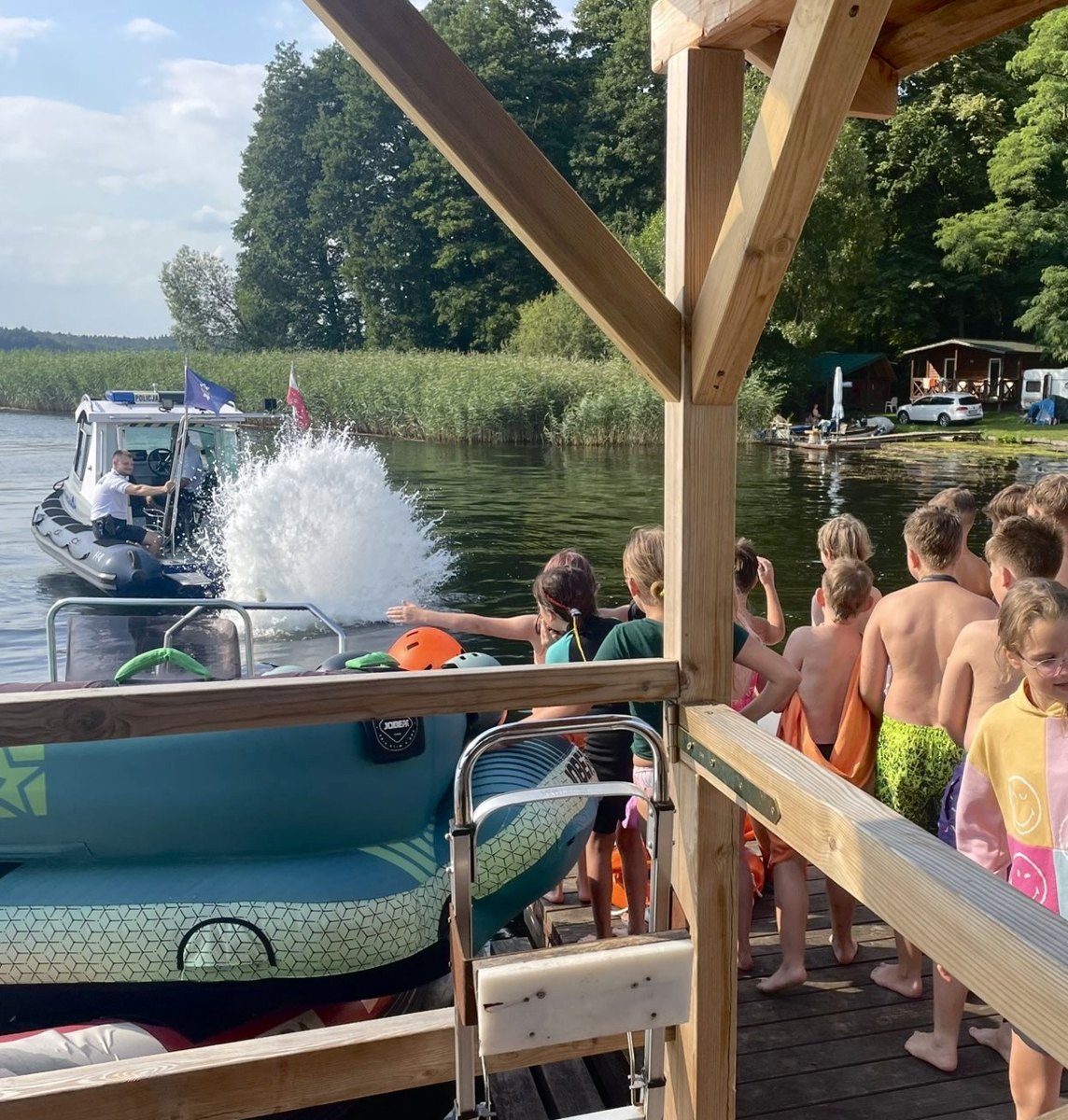 W trosce o bezpieczeństwo najmłodszych, policyjni wodniacy odwiedzili dzieci uczestniczące w kolonii letniej w jednym z ośrodków wypoczynkowych nad Jeziorem Drwęckim w pobliżu Ostródy. Spotkanie miało charakter edukacyjny i było poświęcone zasadom bezpiecznego wypoczynku nad wodą.