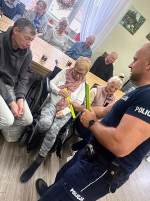 Funkcjonariusze zachęcali, by seniorzy nosili odblaski nie tylko poza obszarem zabudowanym, ale również w mieście – na ubraniach, torbach, laskach czy rowerach. To prosty, tani i skuteczny sposób, by poprawić swoje bezpieczeństwo. Policjanci przekazali uczestnikom spotkania materiały profilaktyczne i rozdali opaski odblaskowe.
