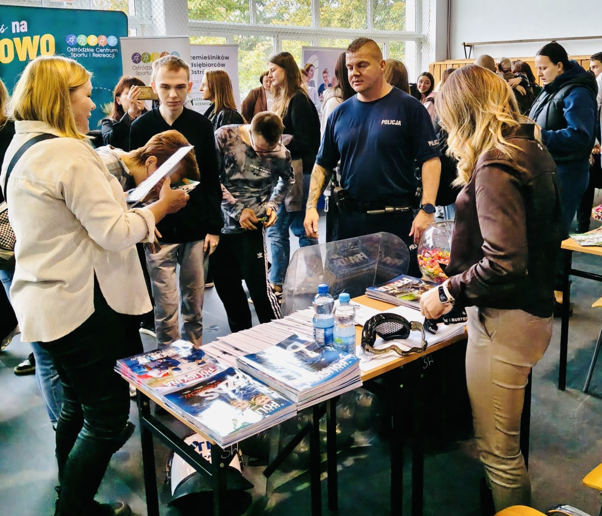 W czwartek (23.10.2025r.) w Zespole Szkół Zawodowych im. Stanisława Staszica odbyły się Ostródzkie Targi Pracy. Celem inicjatywy było udzielenie wsparcia młodzieży i osobom poszukującym pracy w wyborze przyszłej ścieżki zawodowej. Targi miały także na celu ukazanie nowych perspektyw oraz trendów na rynku pracy. Policyjne stanowisko cieszyło się dużym zainteresowaniem, zwłaszcza wśród tych pierwszych. Była to doskonała okazja do przybliżenia zainteresowanym zawodu policjanta czy obowiązujących kryteriów wstąpienia w szeregi Policji. O szczegółach opowiadały przedstawicielki Zespołu Kadr i Szkolenia ostródzkiej jednostki. O realiach pełnionej służby zainteresowani mogli porozmawiać z ostródzkim profilaktykiem. Wszyscy chętni, mogli uzyskać informacje dotyczące wymagań jakie musi spełnić kandydat do służby, a także zapoznać się z poszczególnymi etapami rekrutacji.