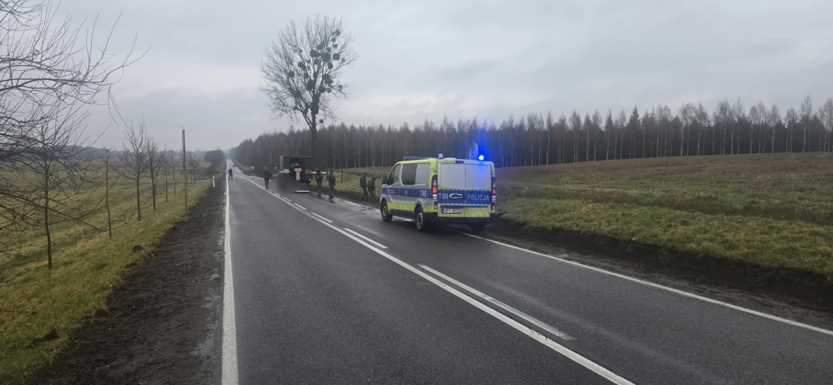 W piątek (14.11.2025r.) około godziny 9:00 oficer dyżurny ostródzkiej jednostki policji został powiadomiony o tym, że podczas prac drogowych na odcinku drogi wojewódzkiej nr 542 pomiędzy miejscowościami Frygnowo – Gierzwałd odnaleziono niewybuch.