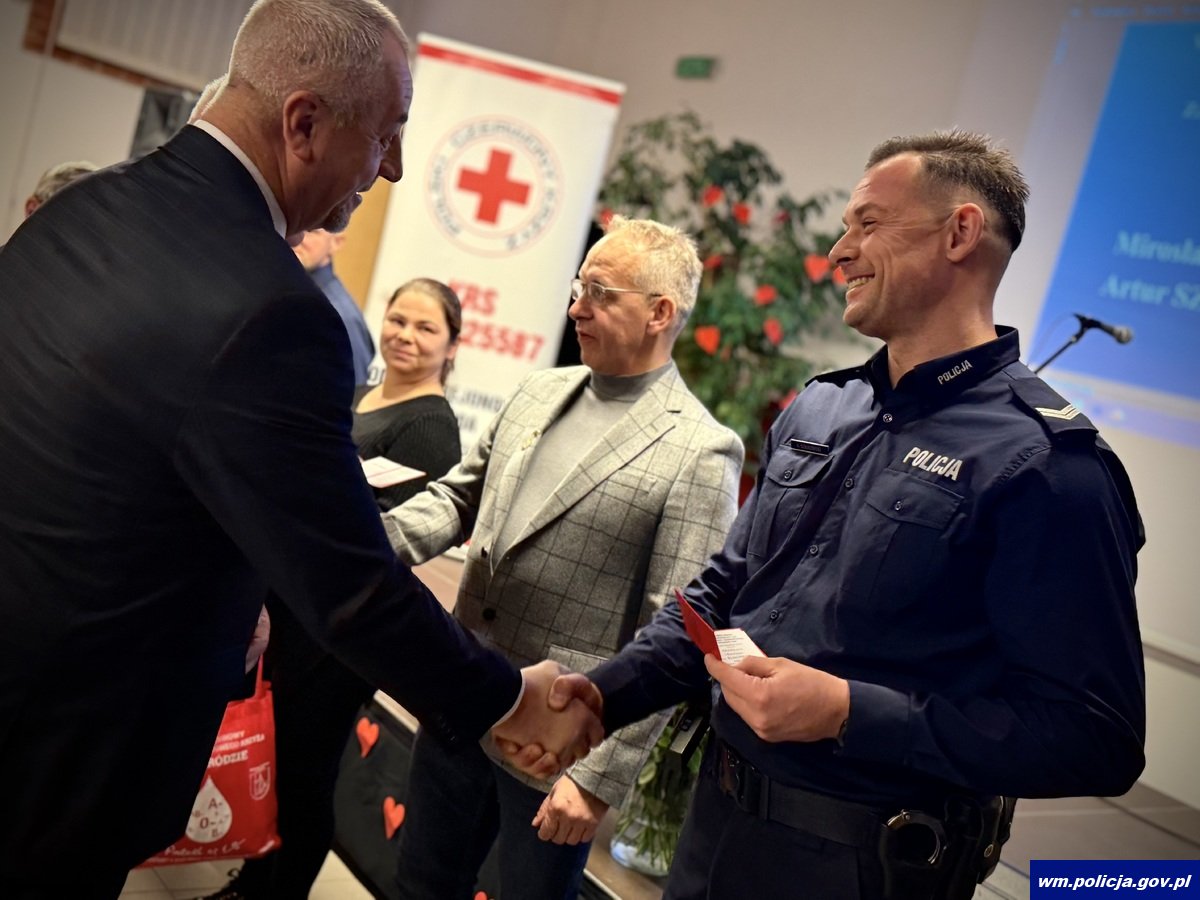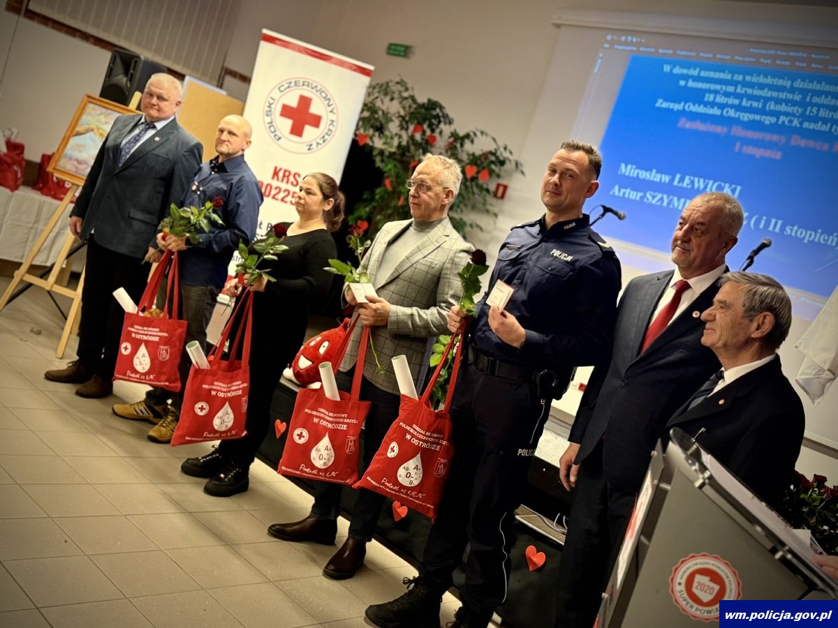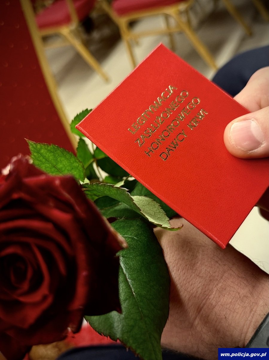 Jednym z nich jest st. sierż. Arkadiusz Sółkowski, ostródzki dzielnicowy, który 26 listopada 2025 roku podczas uroczystej gali odebrał legitymację Zasłużonego Honorowego Dawcy Krwi. Na swoim koncie ma już ponad 18 litrów oddanej krwi, a kilka lat temu poszedł jeszcze o krok dalej – oddał szpik kostny swojemu genetycznemu bliźniakowi, ratując mu życie.