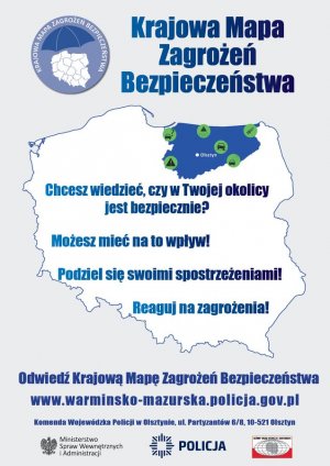 Każdy obywatel naszego kraju ma wpływ na bezpieczeństwo w swoim najbliższym otoczeniu. Krajowa Mapa Zagrożeń Bezpieczeństwa została uruchomiona we wszystkich województwach. Interaktywne narzędzie pozwala mieszkańcom na wskazanie miejsc, w których zagrożone są bezpieczeństwo lub porządek publiczny.Dzięki Krajowej Mapie każdy mieszkaniec może przekazywać Policji informację o zagrożeniu bez konieczności wychodzenia z domu. Narzędzie umożliwia obywatelom jeszcze łatwiejszy kontakt z funkcjonariuszam